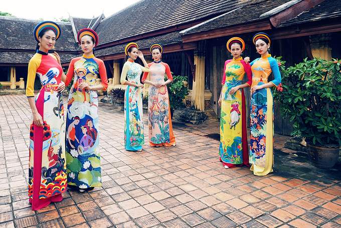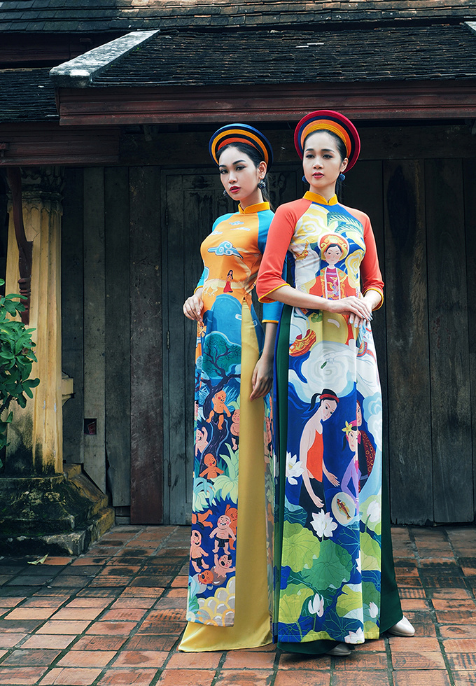 Họa tiết trên thân áo được thiết kế dựa trên những nhân vật cổ tích như Tấm Cám, Sơn Tinh - Thủy Tinh, Âu Cơ - Lạc Long Quân...