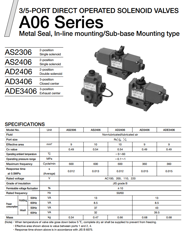 - Van điện từ series ADE3406: Là dòng van 5/3 ( 5 cửa 3 vị trí, xả ở giữa ). Van sử dụng 2 coil điện. Coil điện có chức năng làm di chuyển con trượt bên trong, con trượt hoạt động làm thay đổi trạng thái của van, mở cửa khí cấp cho xi lanh. Size van 1/8” và 1/4”, áp lực Max 1,0 Mpa.