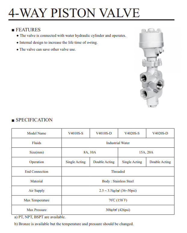 - Van 4 ngả V4010S sử dụng cho nước công nghiệp, nhiệt độ max 700C áp lực max 30 Kg / cm2.Van hoạt động piston khí nén có thể lựa chọn kiểu tác động đơn hoặc tác động kép, van thiết kể nhỏ gọn dễ dàng lắp đặt tiết kiệm diện tích hoạt động chính xác, hiệu quả cao.