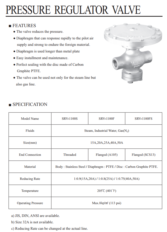 - Van điều áp SRV sử dụng hơi ( 2050C) nước công nghiệp gas ( N2) áp lực max 8 bar, van thiết kế nhỏ gọn , tiết kiệm diện tích lắp đặt hoạt động chính xác, hiệu quả cao.