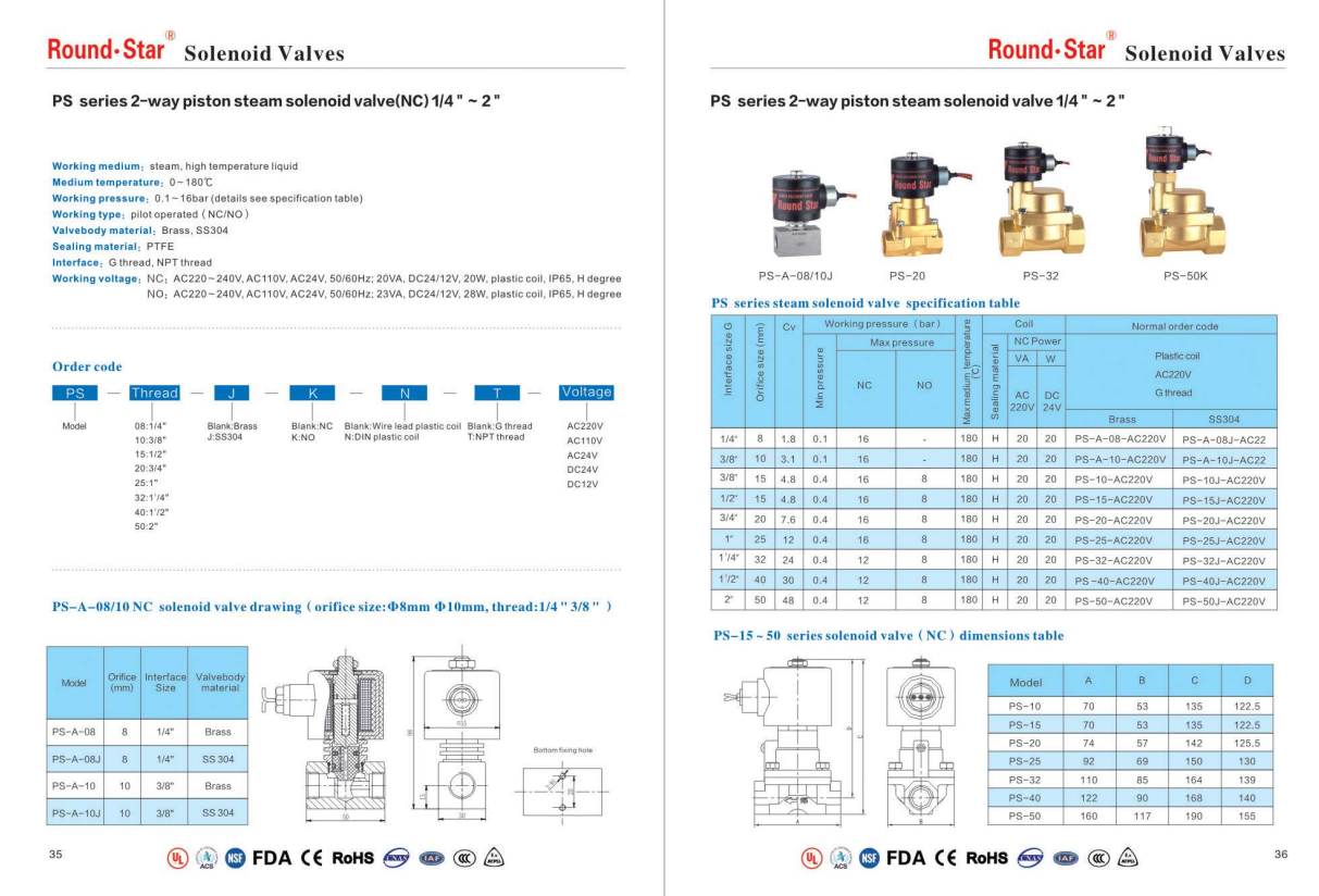 Van điện từ Model PS thiết kế kiểu thường đóng đươc ký hiệu là (NC) khi cấp nguồn điện dưới tác động lực hút của cuộn từ trục piston của van được nâng lên khỏi vị trí đóng cho dung dịch chảy qua, khi muốn đóng van nguồn điện được cắt cuộn hút không còn tác động lò xò đẩy nằm trong ống nén của trục piston bung ra và đẩy trục piston về vị trí đóng cắt dòng chảy qua van