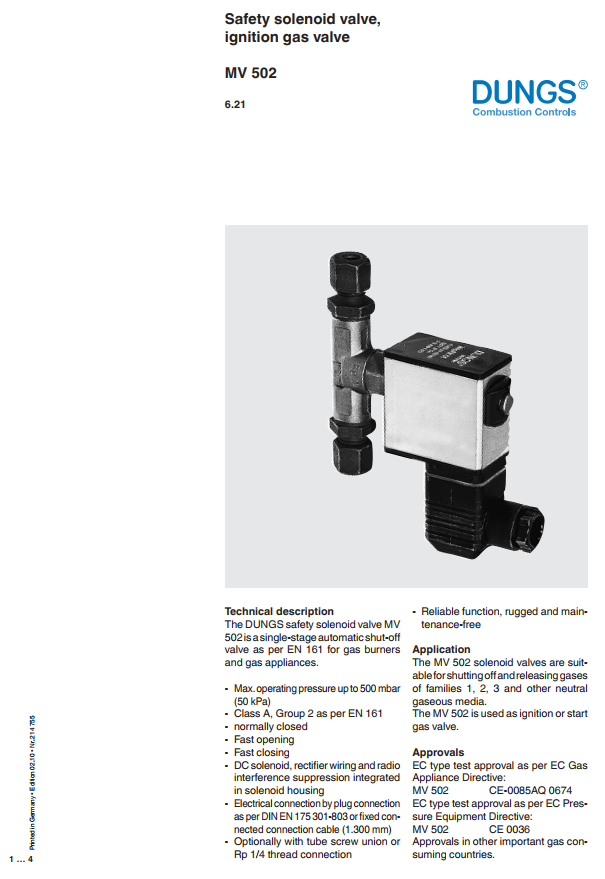 Công ty thiết bị Tự Động Hóa Cao Đạt xin giới thiệu tới quý khách hàng sản phẩm van điện đánh lửa gas model MV 502 thương hiệu Dungs - Germany.