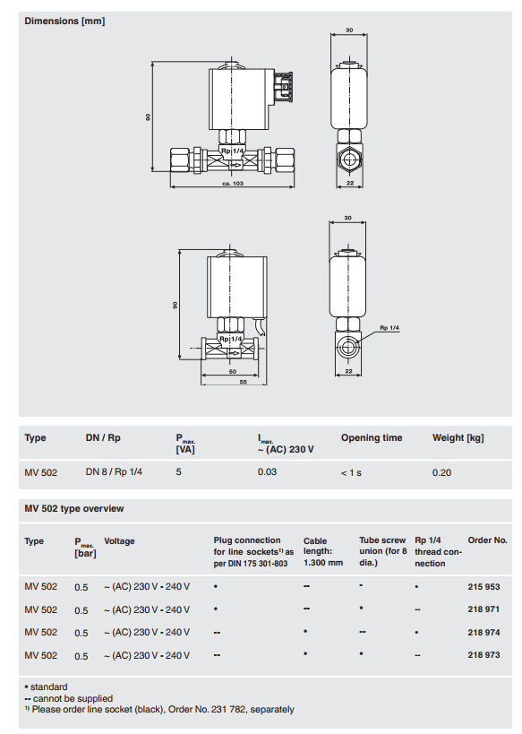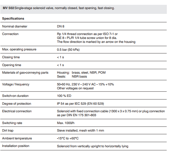 - Van điện đánh lửa gas model MV 502 đây là dòng van đánh lửa cho gas, size van DN 8 áp lực P max 0,5 bar ( 50 Kpa) thời gian đóng và mở <1S, thân van bằng đồng , thép, màng van NBR, nhiệt độ - 150C đến + 600C chuẩn IP 54.