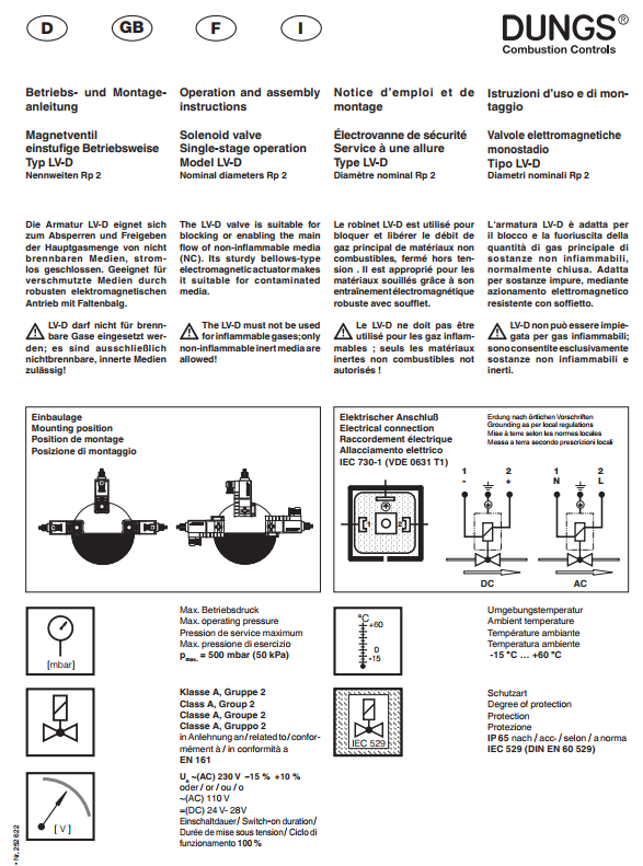 - Van điện từ gas LV-D là dòng van mở 1 cấp, sử dụng 1 coil điện, kiểu thường đóng NC. Tiêu chuẩn IP 65. Thân hợp kim nhôm, coil plastic, áp lực Pmax 500mbar, nhiệt độ độ -15oC đến +60oC.