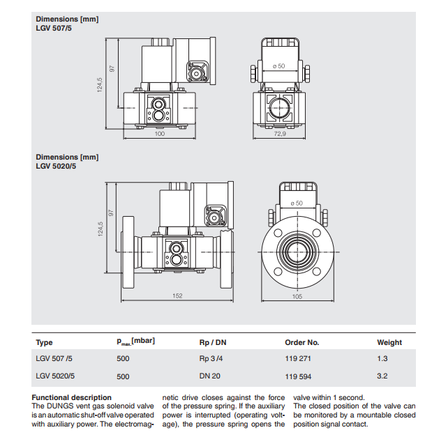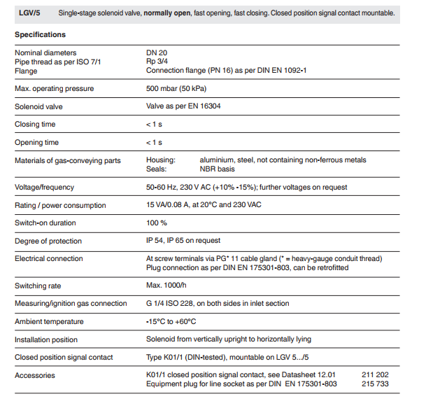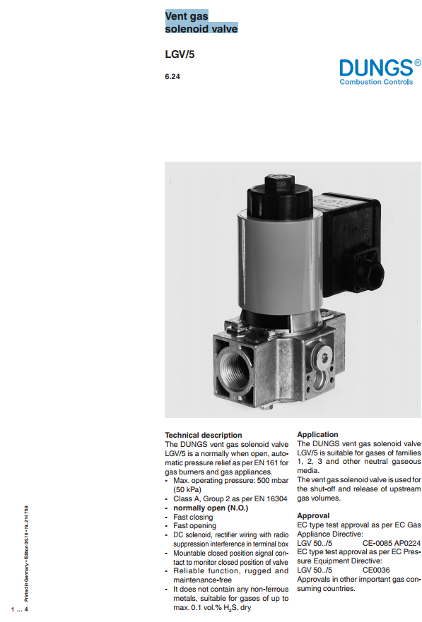 - Van LGV/5 là dòng van xả sử dụng 1 coil điện. Thân van hợp kim nhôm, màng van NBR. Áp lực Pmax 500mbar. Nhiệt độ -15oC đến + 60oC.