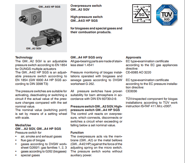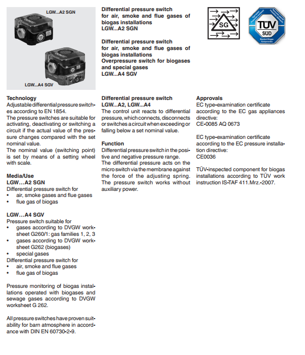 - Công tắc áp suất LGW…. Là dòng công tắc đặt chênh áp sử dụng cho khí Biogas Áp max 500mbar, nhiệt độ -15oC đến +70oC ( IP65).