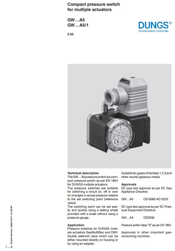 Công ty thiết bị Tự Động Hóa Cao Đạt xin giới thiệu tới quý khách hàng sản phẩm công tắc áp suất GW….A5 và GW…. A5/1 thương hiệu Dungs - Germany.
