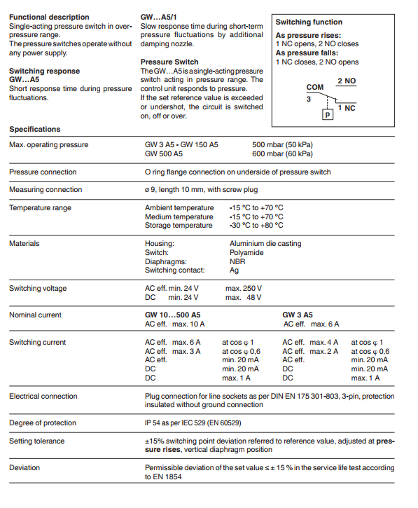 - Công tắc áp suất GW….A5 và GW…. A5/1 là dòng công tắc thiết kế kiểu Compacs, thân hợp kim nhôm, vỏ Polyamide, màng NBR, tiếp điểm Ag, áp lực Pmax 600m bar ( 60 Kpa) nhiệt độ - 150C đến +700C.