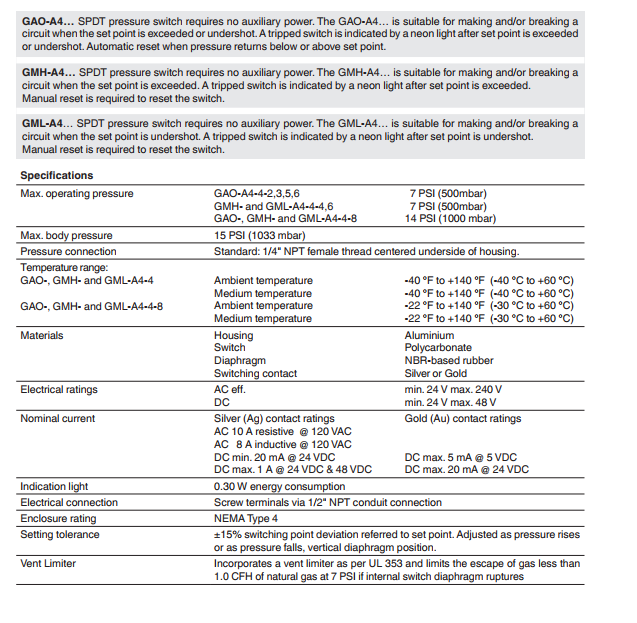 - Công tắc áp suất gas GAO, GMH, GML là dòng công tắc đặt áp cho gas và khí thân hợp kim nhôm, vỏ Plastic, màng NBR, tiếp điểm Solver., áp lực Pmax 500m bar và 1000m bar, nhiệt độ - 400C đến + 600C.