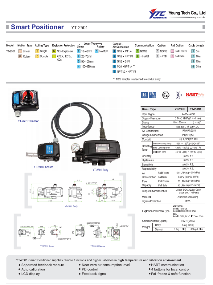 - Bộ điều khiển YT - 2501 là dòng Smart positioner dùng tín hiệu input 4 ~ 20mA qua bộ phản hồi tín hiệu để đóng mở cho van YT- 2501 thiết kế nhỏ gọn, tiết kiệm diện tích lắp đặt, họat động chính xác hiệu quả cao.