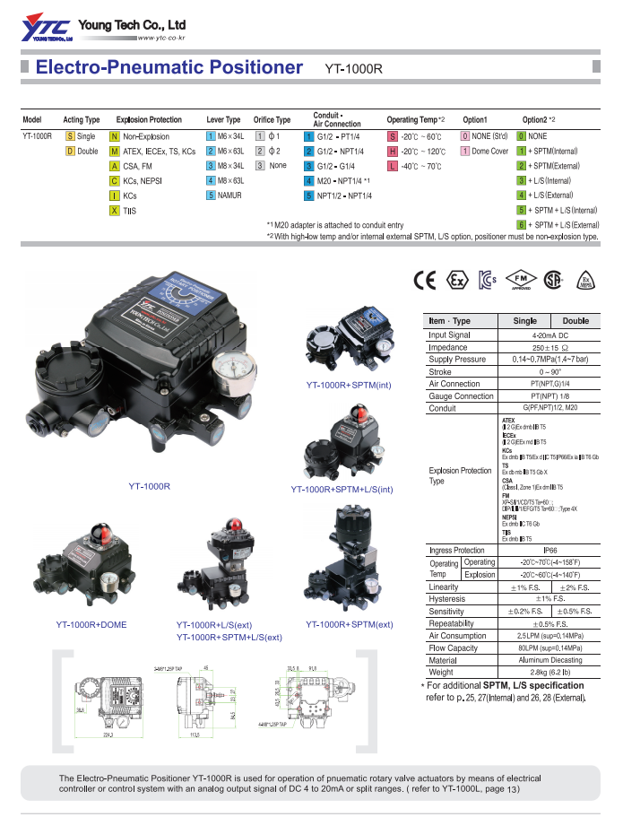 - Bộ điều khiển tuyến tính YT- 1000R là bộ dùng tín hiệu 4 ~ 20mA input và output để chia nhỏ góc mở và đóng của van theo tỷ lệ đã đặt. Bộ YT- 1000R phù hợp cho van đóng mở kiểu xoay ( Rotary) như van bướm, van bi, cửa gió có góc xoay từ 0 ~ 900