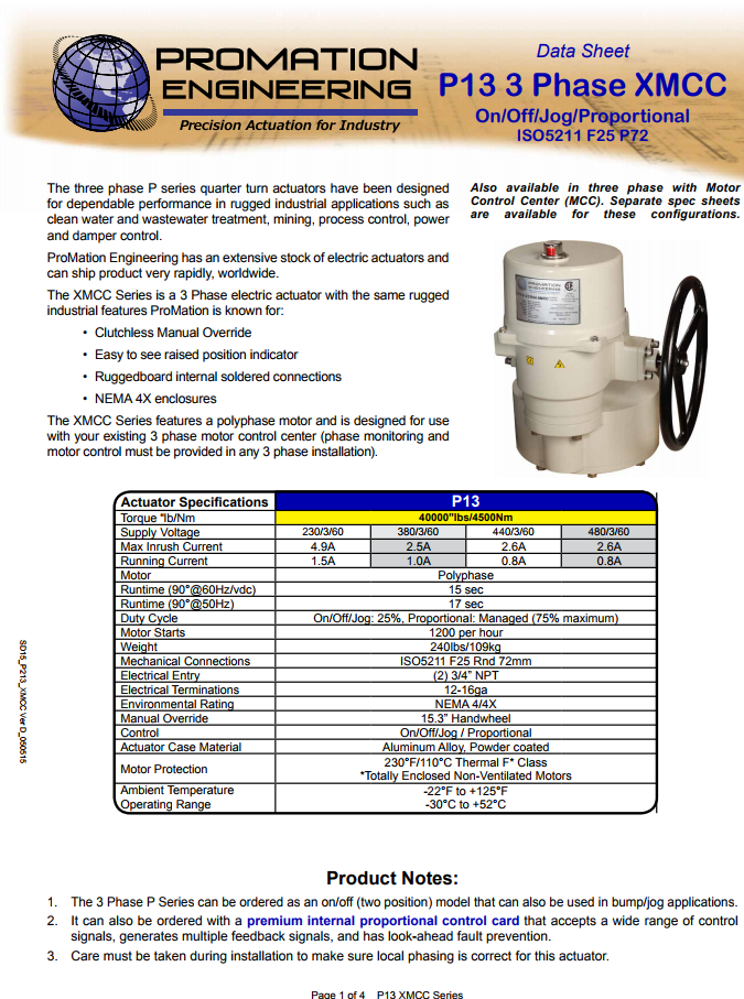 - Bộ điều khiển van P13 là bộ điều khiển có công suất lớn áp Torque 4500Nm, series P13 được thiết kế bộ hộp số nằm ngoài phù hợp lắp đặt cho van có size lớn, mặt bích kết nối với van tiêu chuẩn ISO 5211 ( F25) thời gian cho góc mở 900 -50Hz là 95 sec, nhiệt độ môi trường - 300C đến + 520C, thân hợp kim nhôm, sơn Epoxy, tiêu chuẩn NEMA4, 4X, điện áp sử dụng 220V ~ 480VAC.