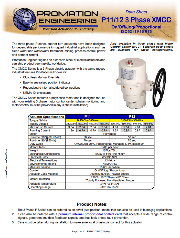 - Bộ điều khiển van P11 - 3 phases XMCC . Series này cho áp Torque 3500Nm sử dụng cho size van lớn, thân vỏ hợp kim nhôm, thiết kế bộ giảm tốc nằm ngoài, mặt bích kết nối van ISO 5211 ( F16) kết hợp tay quay sử dụng khi mất nguồn điện, kiểu đóng mở ON / OFF và Modulting chỉ sử dụng nguồn điện 3 phases.