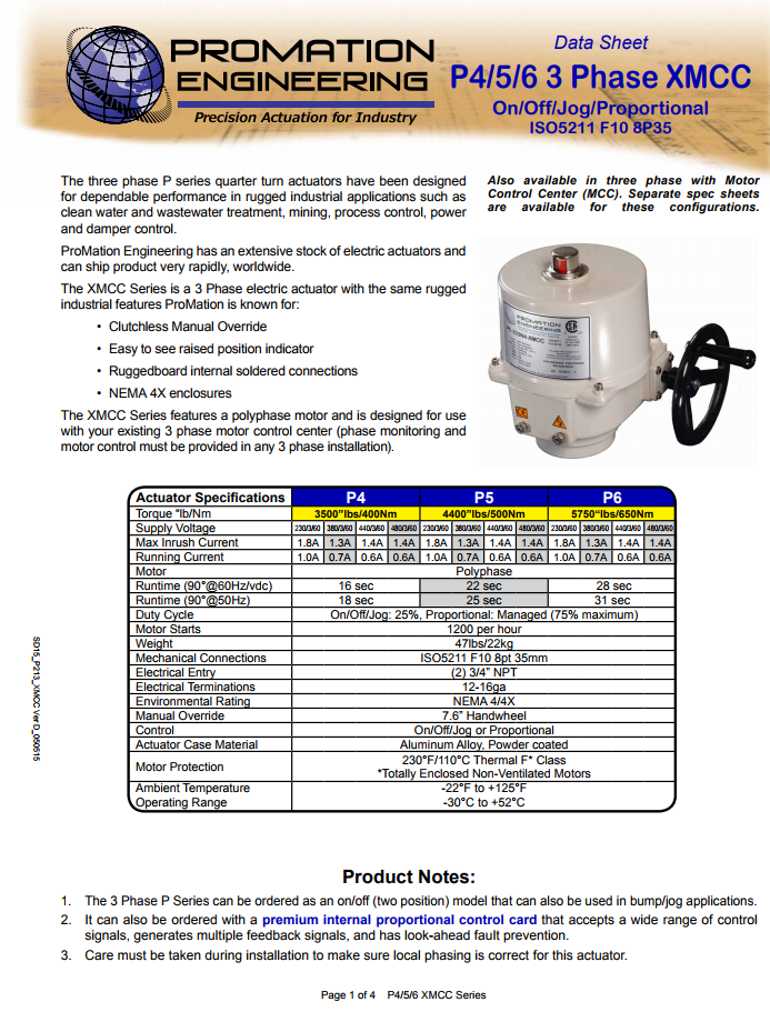 - Bộ điện điều khiển van P4 – 3 phases XMCC: Series này sử dụng nguồn điện 3 phases để điều khiển áp lực torque max 400Nm, đóng mở on / off và đóng mở tỷ lệ góc mở 0o -90o ( on / off 18 sec) bích kết nối tiêu chuẩn ISO 5211 - F10 thiết kế có tay quay ngoài hỗ trợ khi mất nguồn điện.