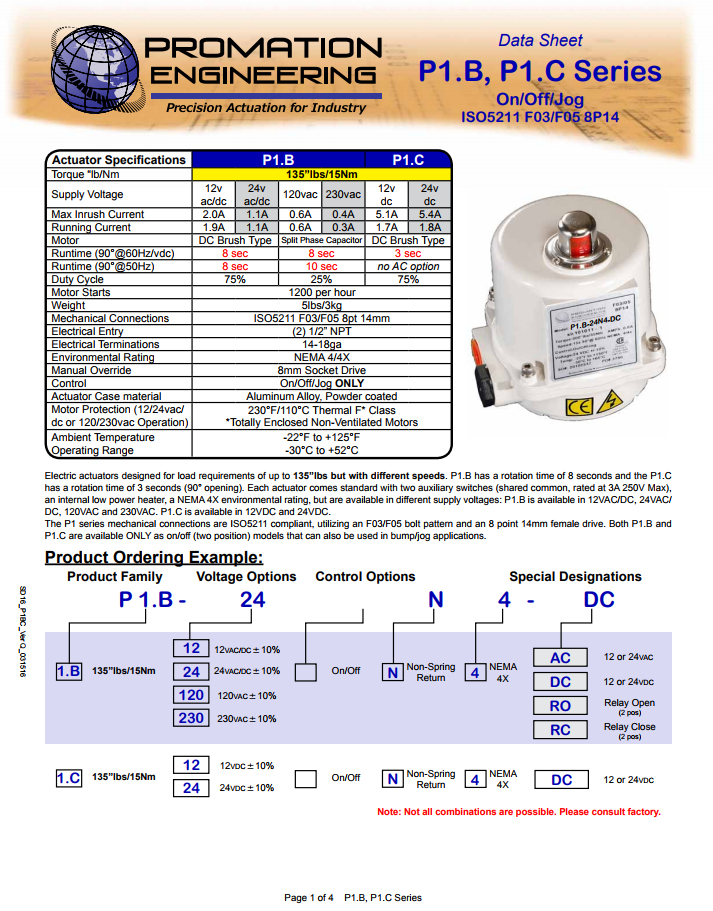 - Bộ điện điều khiển series P1.B và P1.C: 2 series này thiết kế nhỏ gọn Áp torque = 15Nm. Phù hợp cho size van nhỏ đóng mở ON/ OFF ( Rotary 0o - 90o ) đạt chuẩn NEMA4/4x.