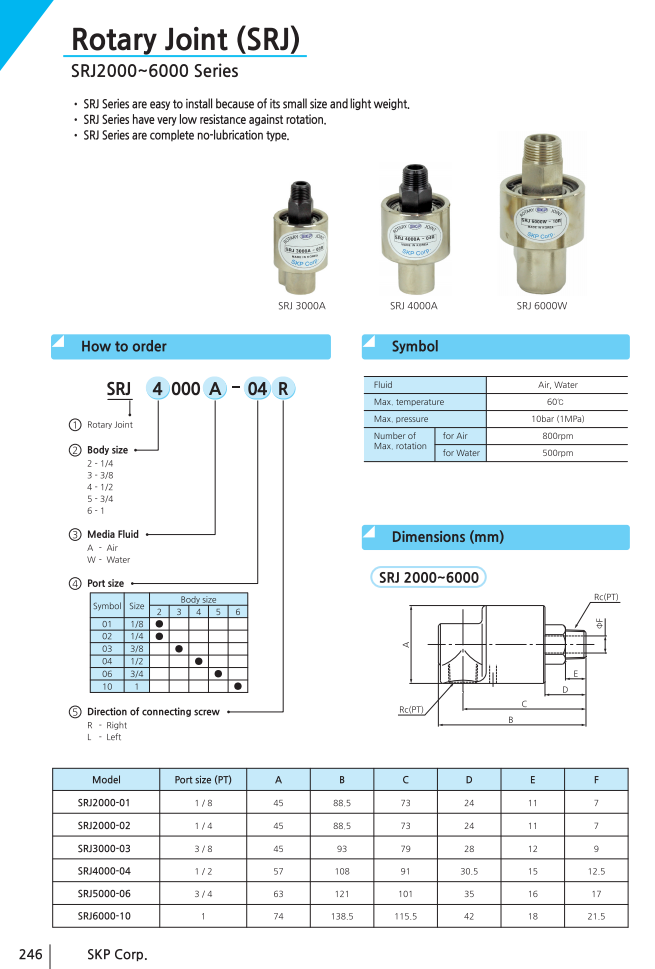 - Khớp quay SRJ Series này sử dụng cho khí và nước, thiết kế nhỏ gọn, áp lực 10 bar, sử dụng khí cho tốc độ 800rpm và nước là 500rpm.