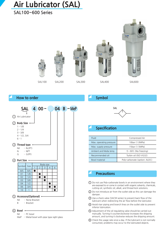 - Cốc dầu SAL 100 và SAL 600 đây là cốc dầu có chức năng đưa dầu để bôi trơn cho hệ thống van và xi lanh khi làm việc, cốc dầu hoạt động như sau: Cốc dầu ta phải thường xuyên có dầu theo vạch báo mức ở vỏ cốc lọc áp lực khí đi qua hút dầu lên qua ống nhựa nhỏ lên đi qua van zilơ dầu tạo thành như sương mù theo khí qua cửa thoát ra ngoài đi làm việc.