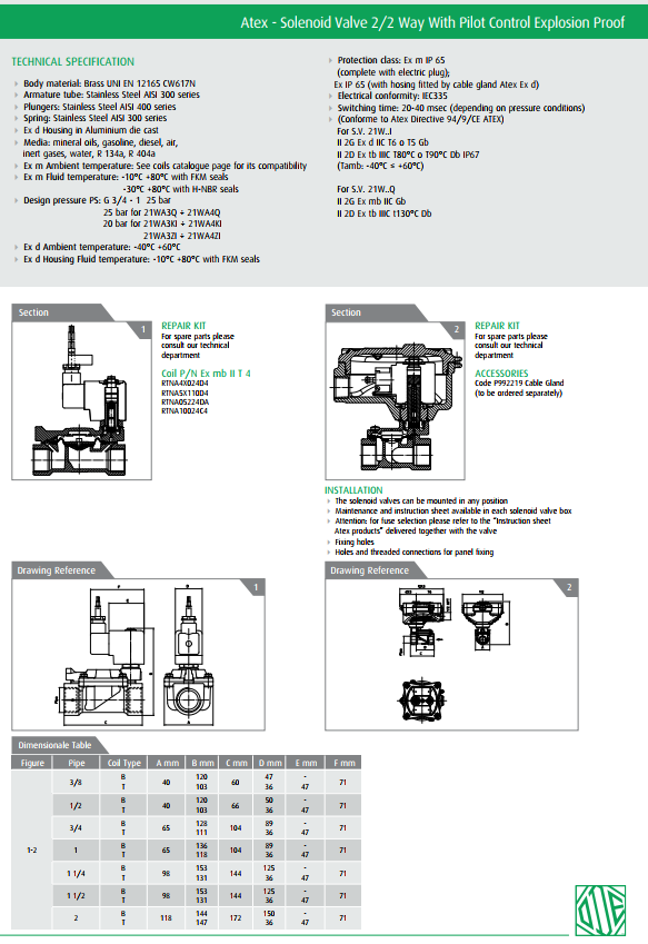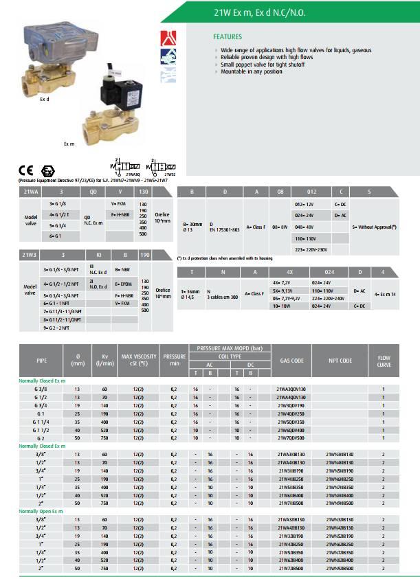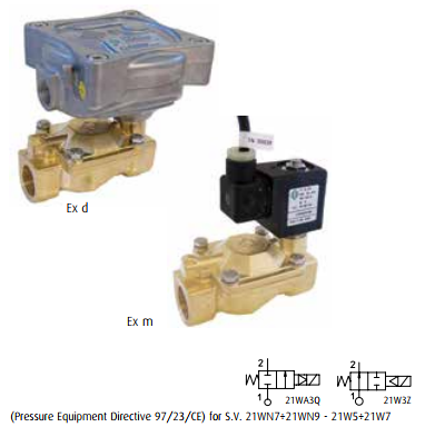 - Van điện từ 21W Exm và 21W Exd là dòng van sử dụng coil điện chống cháy nổ, van có 2 trạng thái thường đóng ( NC) và thường mở ( NO) thân van vật liệu đồng, size van 3/8’’ đến 2’’. Áp lực Pmax 25 bar, nhiệt độ - 10oC đến + 80oC sử dụng nước, dầu, khí, gas.