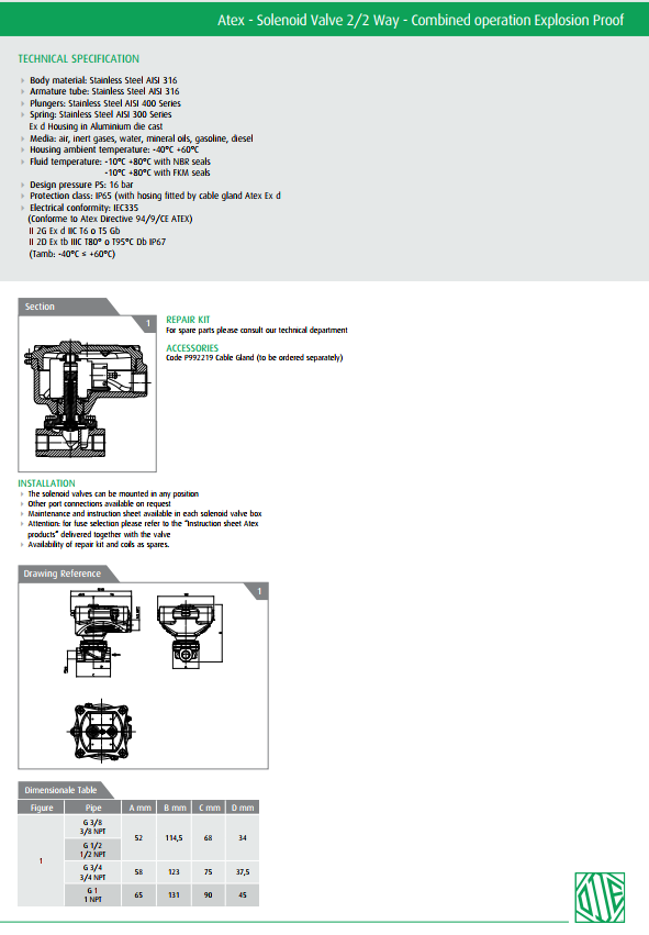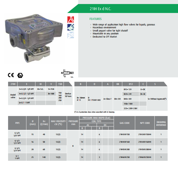 - Van điện từ 21IH Exd và 21IN Exd là dòng van sử dụng coil điện chống cháy nổ, thân vật liệu inox 316 sive van 3/8’’ đến 1’’ áp lực Pmax, nhiệt độ - 10oC đến + 80oC sử dụng nước, khí, dầu, gas.