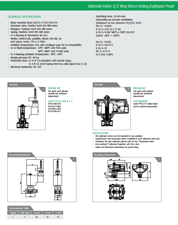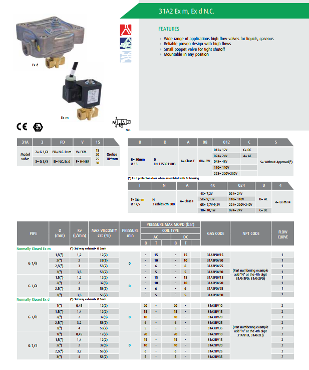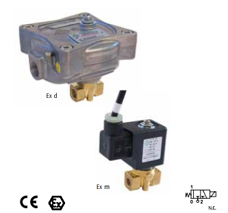 - Van điện từ 31A2 Exm và 31A2 Exd. Là dòng van 2/2 sử dụng coil điện chống cháy nổ, van có trạng thái thường đóng ( NC) thân van vật liệu đồng áp lực Pmax 40 bar, nhiệt độ - 40oC đến + 60oC, sử dụng nước, khí, dầu, gas.