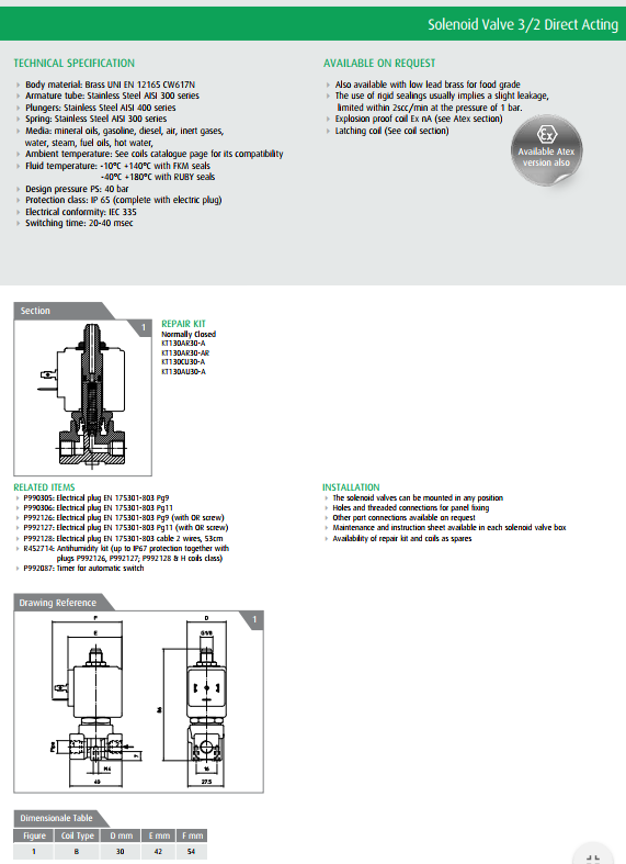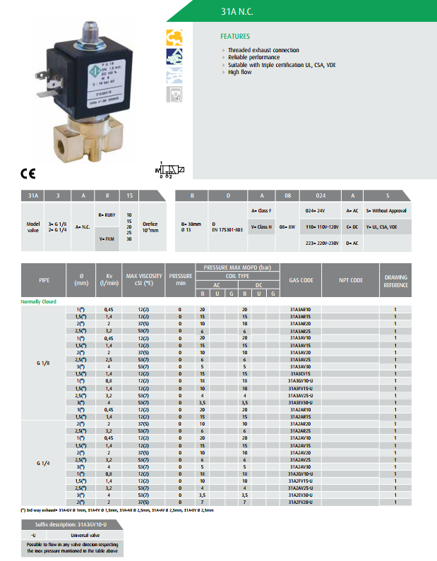 Van điện từ ODE có model từ 31A3AR10 ~ 31A2FV20- U là dòng van 3/2 thân vật liệu đồng, trạng thái van kiểu thường đóng ( NC).