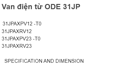 Van điện từ ODE : 21A3KV15, 21A3KV20, 21A3KV25, 21A3KV30, 21A3KV45, 21A2KV15, 21A2KV20, 21A2KV25, 21A2KV30, 21A2KV45, 21A2KV55
