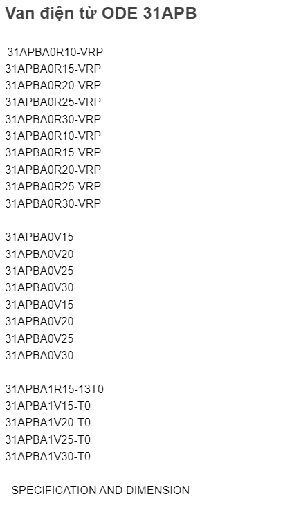 Van điện từ ODE : 21A3KV15, 21A3KV20, 21A3KV25, 21A3KV30, 21A3KV45, 21A2KV15, 21A2KV20, 21A2KV25, 21A2KV30, 21A2KV45, 21A2KV55