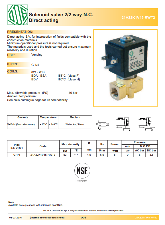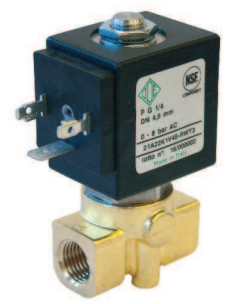 - Van điện từ series 21A22K1V là dòng van 2/2 kiểu thường đóng (NC) , thân đồng kết nối ren1/4 và 1/8. áp lực tùy chọn Pmax 35 bar cho dòng điện AC, nhiệt độ -10oC đến +140oC, sử dụng cho khí nước và hơi