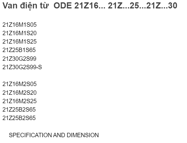 Van điện từ ODE : 21A3KV15, 21A3KV20, 21A3KV25, 21A3KV30, 21A3KV45, 21A2KV15, 21A2KV20, 21A2KV25, 21A2KV30, 21A2KV45, 21A2KV55