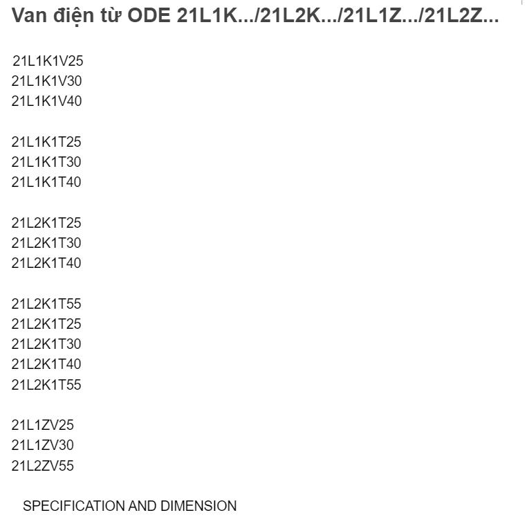 Van điện từ ODE : 21A3KV15, 21A3KV20, 21A3KV25, 21A3KV30, 21A3KV45, 21A2KV15, 21A2KV20, 21A2KV25, 21A2KV30, 21A2KV45, 21A2KV55