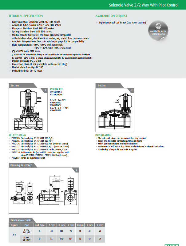 Van điện từ ODE: 21X2KT120 ~ 21XN6K1V250 là dòng van 2/2 thân vật liệu inox 316, trạng thái van ( NC) thường đóng áp lực van 10 bar và 16 bar.