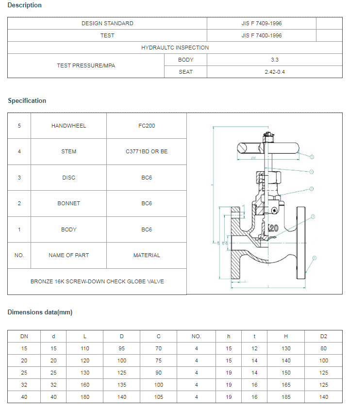 JIS F 7301 Bronze 5K globe valve