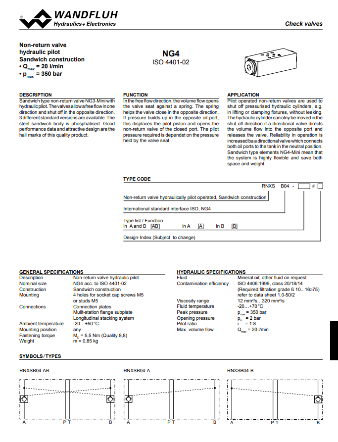 Non-return valve pilot operated sandwich construction RNXSB04-Wandfluh