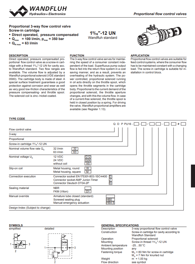 Proportional 3-way flow control cartridge QDPPU16-Wandfluh