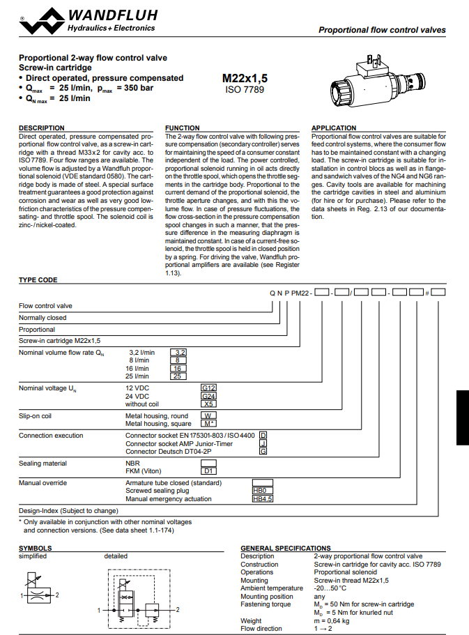 Proportional 2-way flow control cartridge QNPPM22-Wandfluh