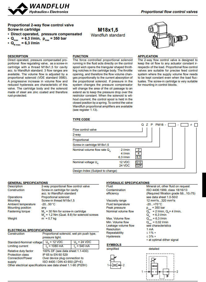 Proportional 2-way flow control cartridge QZPPM18- Wandfluh