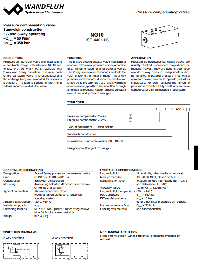 Pressure compensator valve sandwich construction U_FSA10-Wandfluh