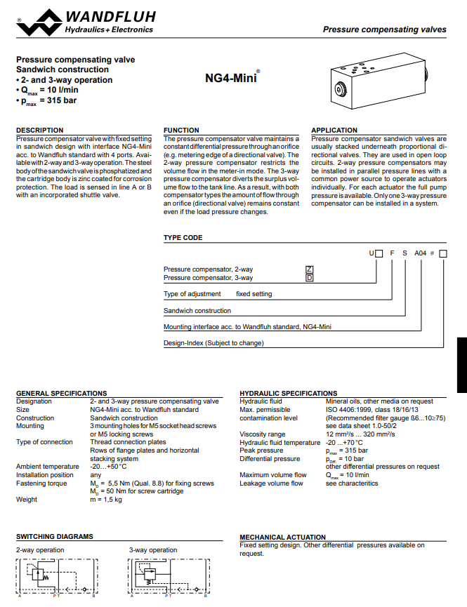 Pressure compensator valve sandwich construction U_FSA04-Wandfluh