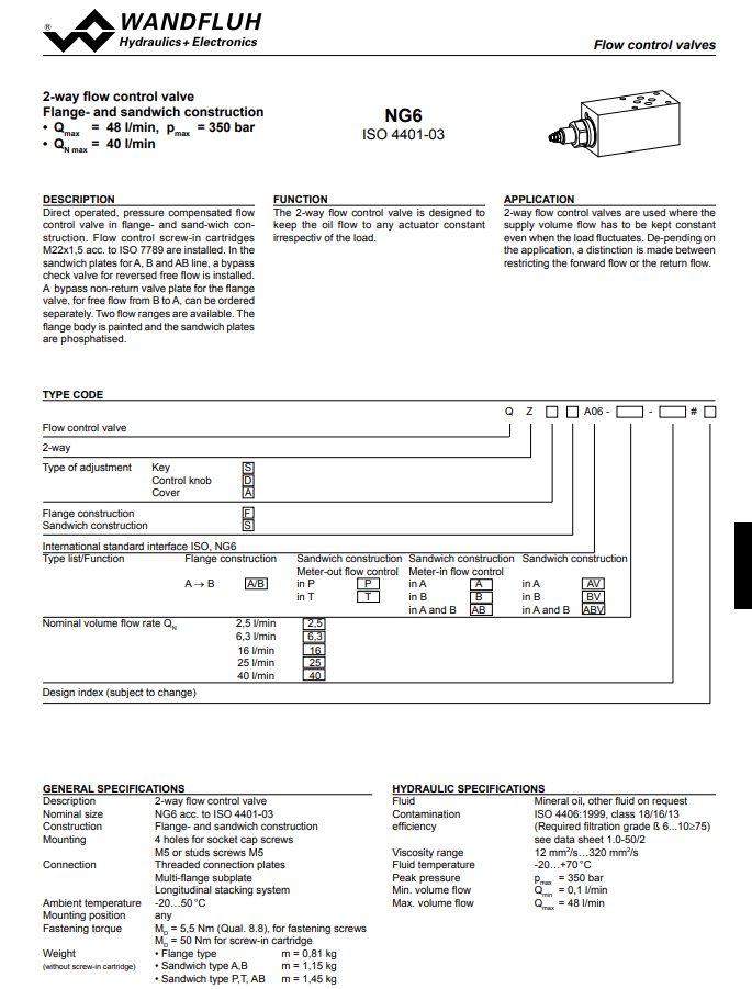 2-way flow control valve flange and sandwich construction QZ_A06-Wandfluh