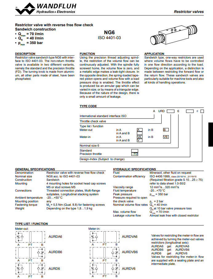 Restrictor valve with reverse free flow sandwich construction AURD_6- Wandfluh
