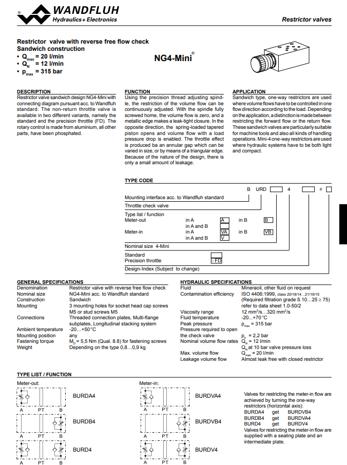 Restrictor valve with reverse free flow sandwich construction BURD_4- Wandfluh