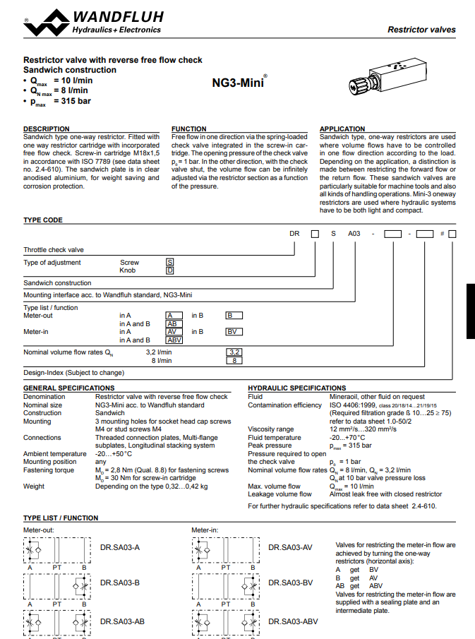 Restrictor valve with reverse free flow sandwich construction DR_SA03- Wandfluh