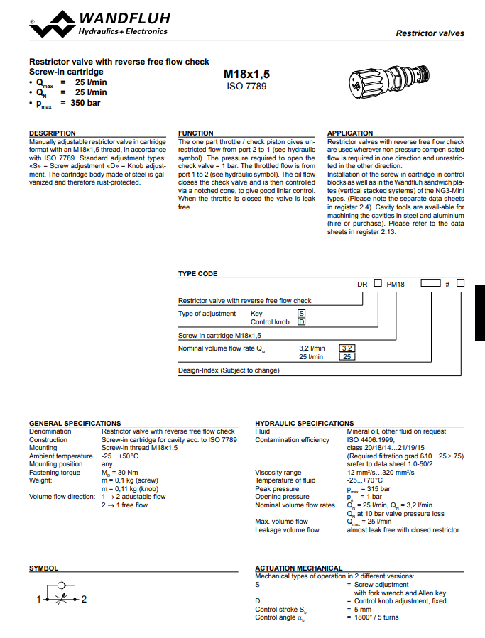 Restrictor cartridge with reverse free flow DR_PM18- Wandfluh