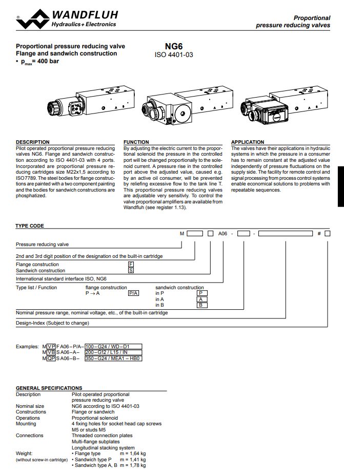 Proportional pressure reducing valve flange and sandwich construction M_A06-Wandfluh