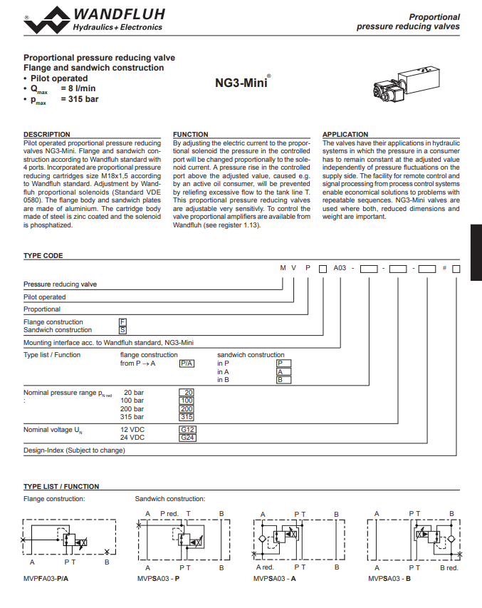 Proportional pressure reducing valve flange and sandwich construction MVP_A03-Wandfluh