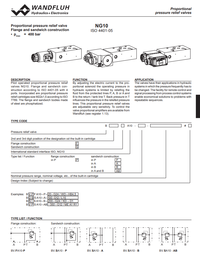 Proportional pressure relief valve flange and sandwich construction B_A10-Wandfluh