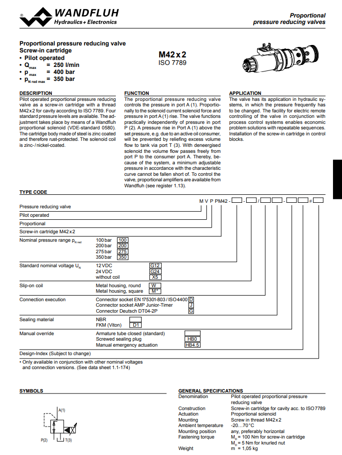 Proportional pressure reducing cartridge pilot operated MVPPM42-Wandfluh
