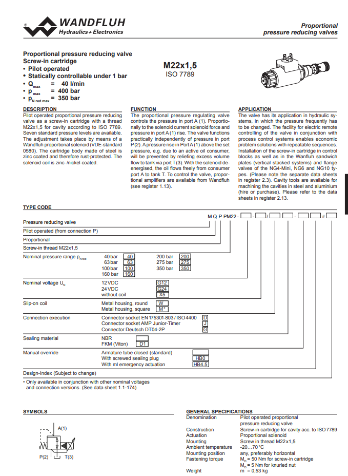 Proportional pressure reducing cartridge pilot operated (slip-on coil) MQPPM22- Wandfluh