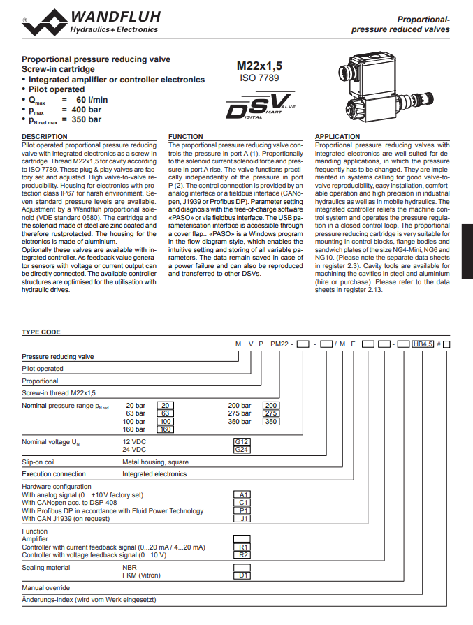 Proportional pressure reducing cartridge pilot operated (slip-on-coil, integrated electronics) MVPPM22_ME-Wandfluh