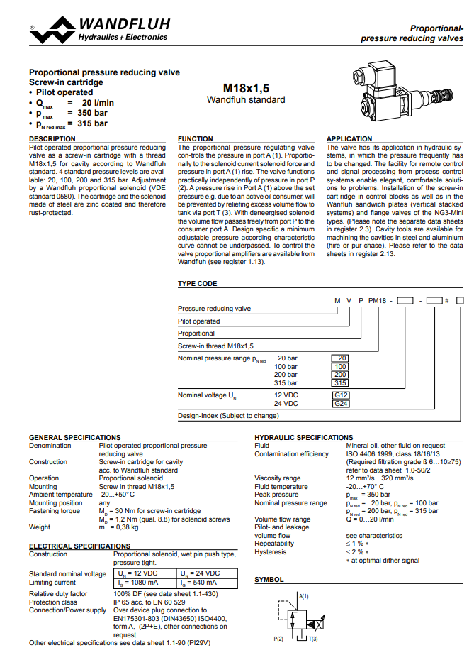 Proportional pressure reducing cartridge pilot operated MVPPM18-Wandfluh